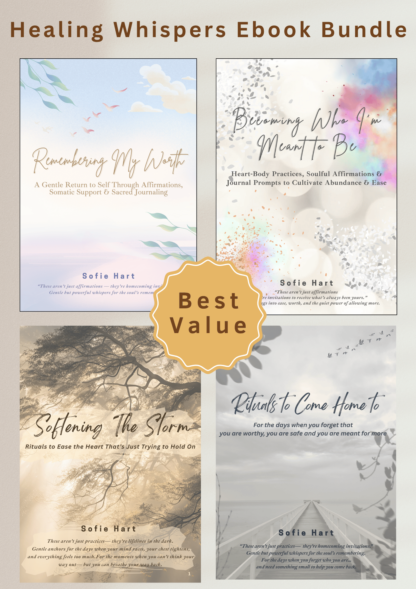 Through over 1,000 affirmations, gentle somatic rituals, and sacred journaling prompts, these four ebooks guide you through every chapter of your healing and becoming: